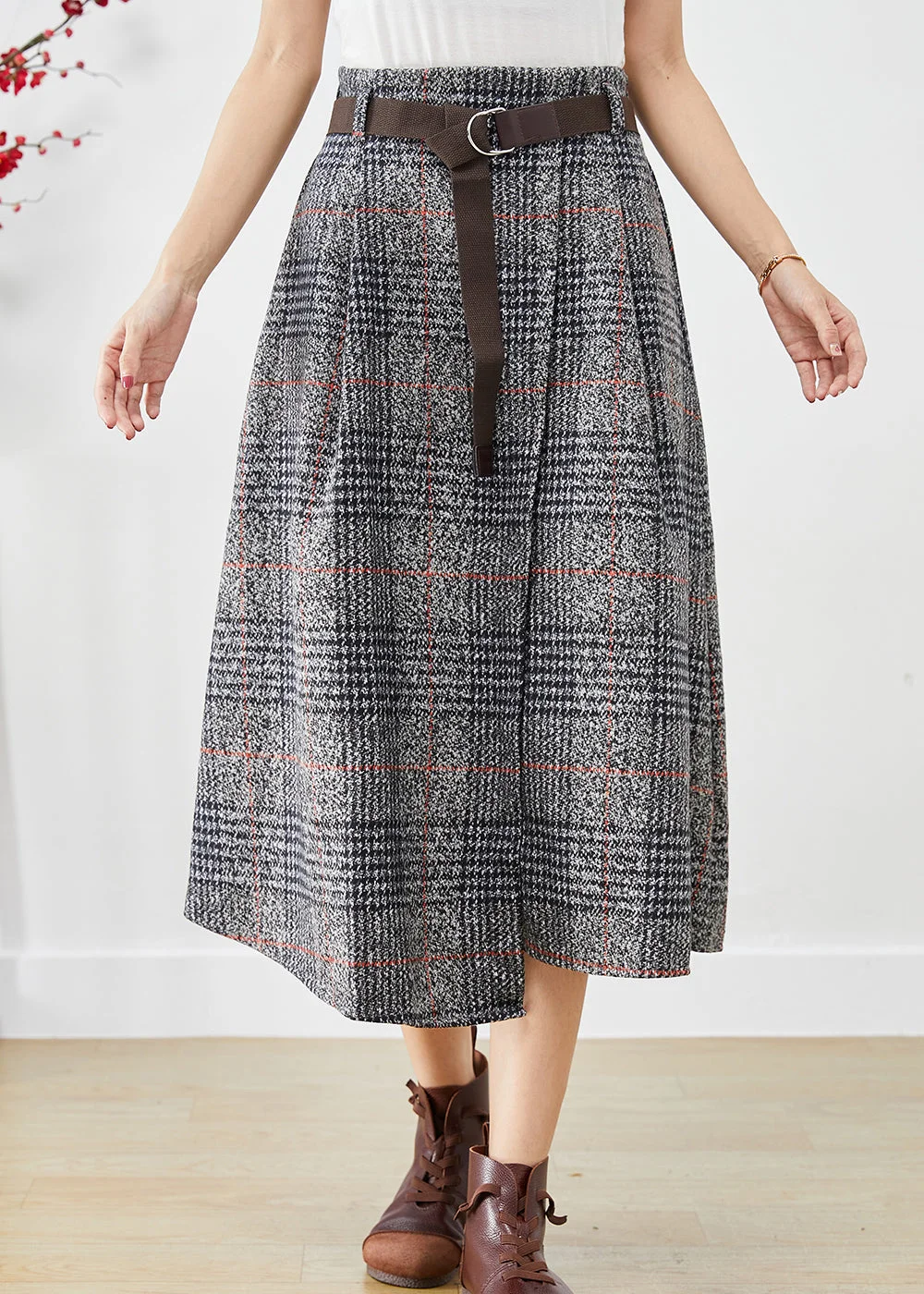 Chic Grey Asymmetrical Plaid Woolen A Line Skirts Fall