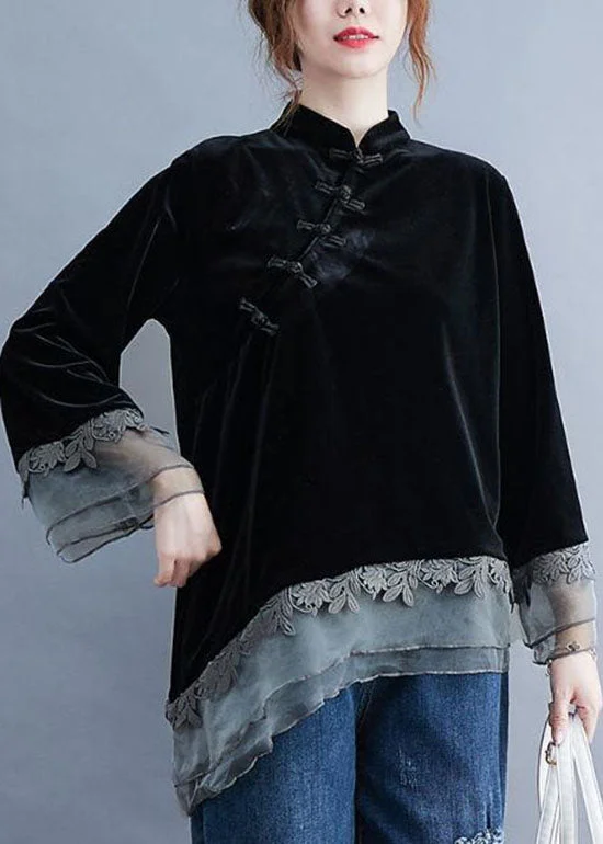 Chinese Style Black Asymmetrical Button Patchwork Silk Velour Blouses Spring