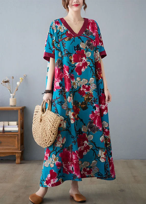 Elegant Blue V Neck Patchwork Print Cotton Dresses Short Sleeve