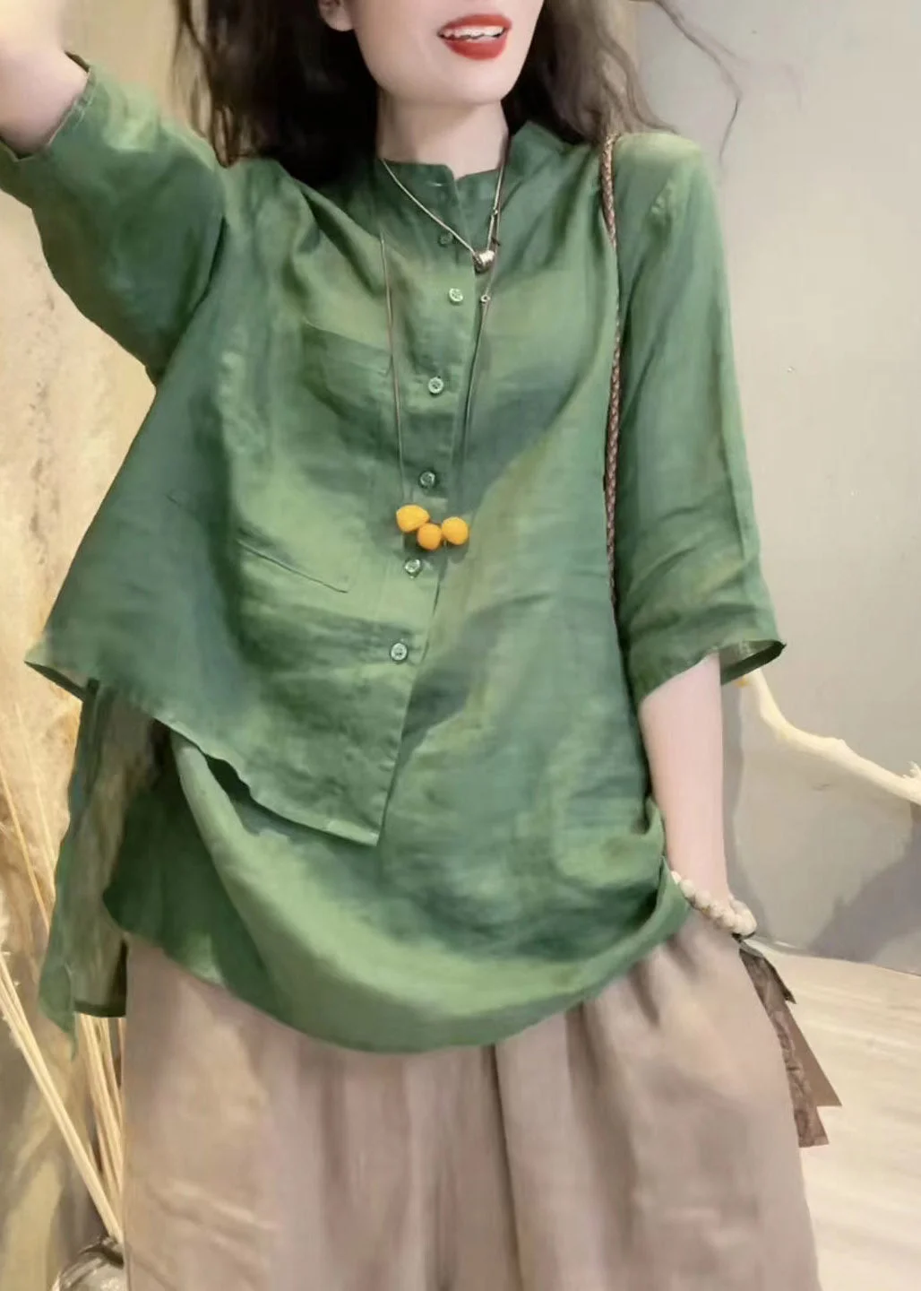 Elegant Green Stand Collar Asymmetrical Button Linen Shirts Long Sleeve
