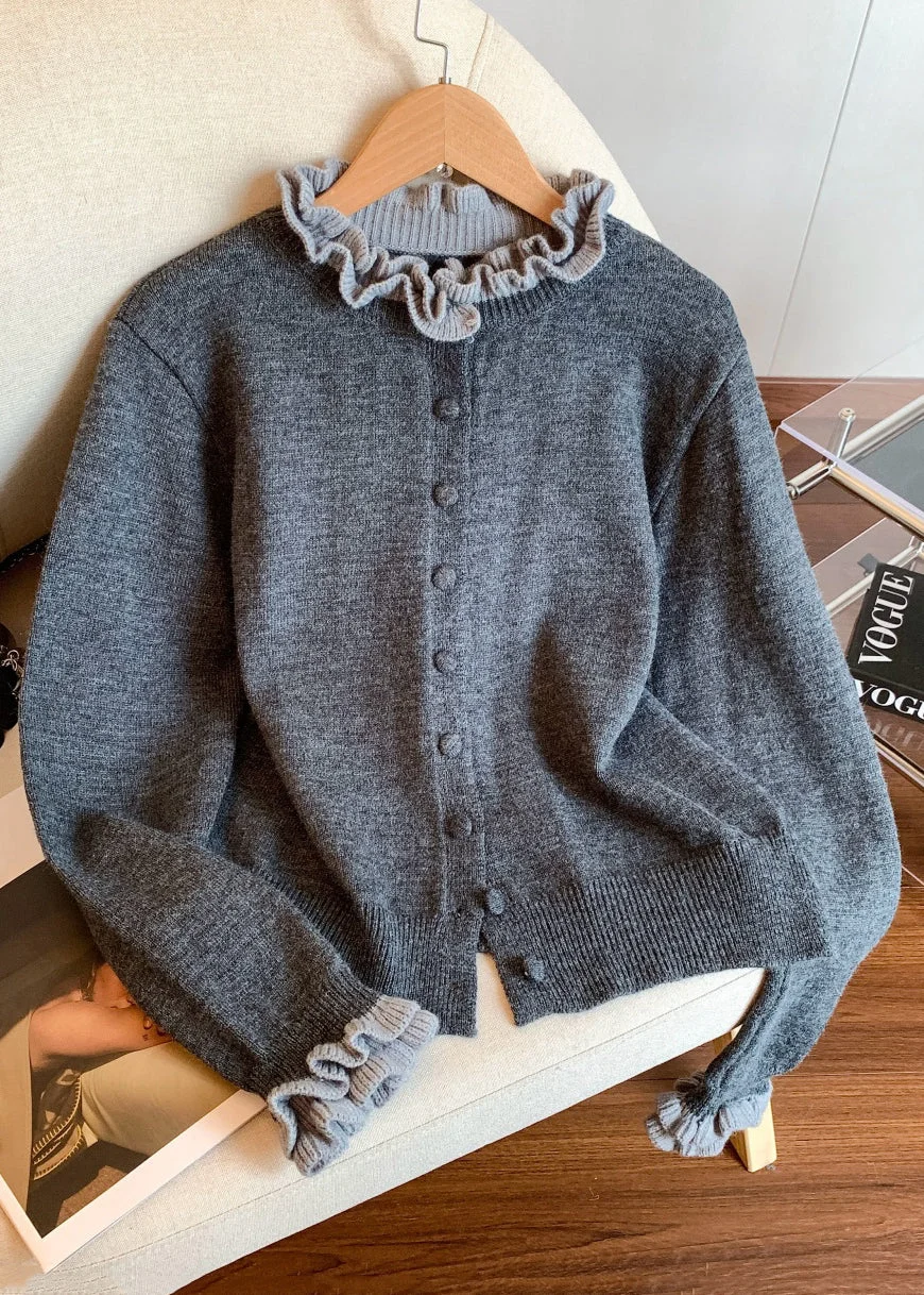 Grey Button Cozy Patchwork Knit Winter Coats Ruffled
