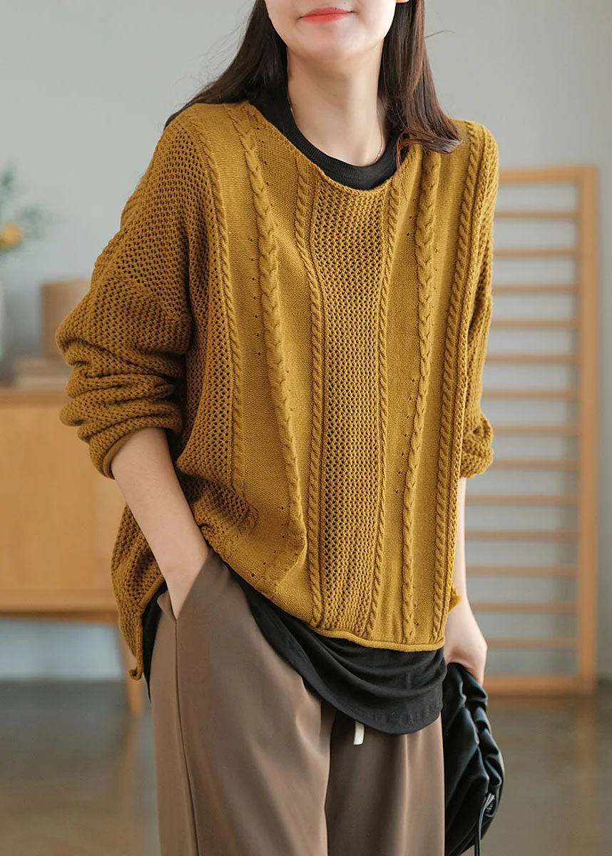 Plus Size Yellow O-Neck Hollow Out Knit Sweaters Fall