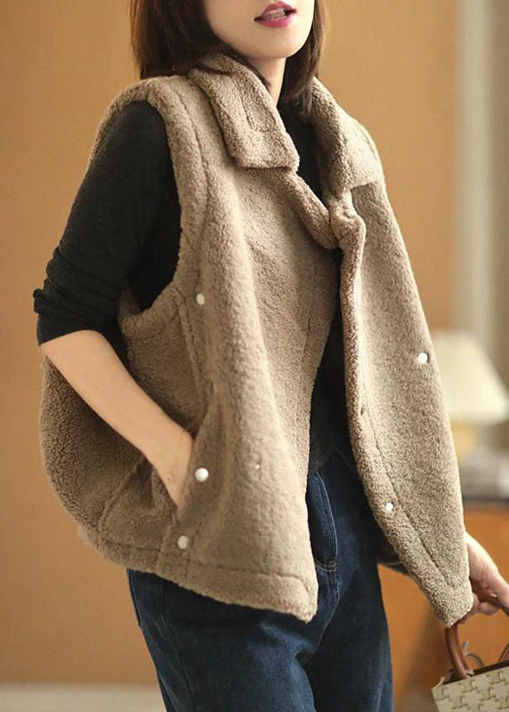 Unique Khaki Peter Pan Collar Faux Fur Vest Sleeveless