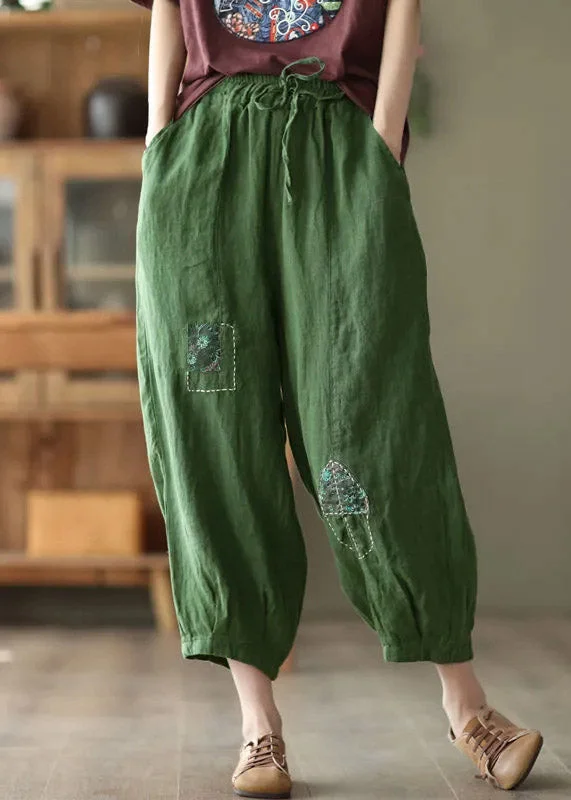 Vintage Green Pockets Print Elastic Waist Linen Harem Pants Summer