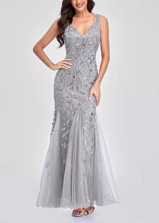 Women Elegant Silver Sleeveless Sequins Mermaid Party Dress